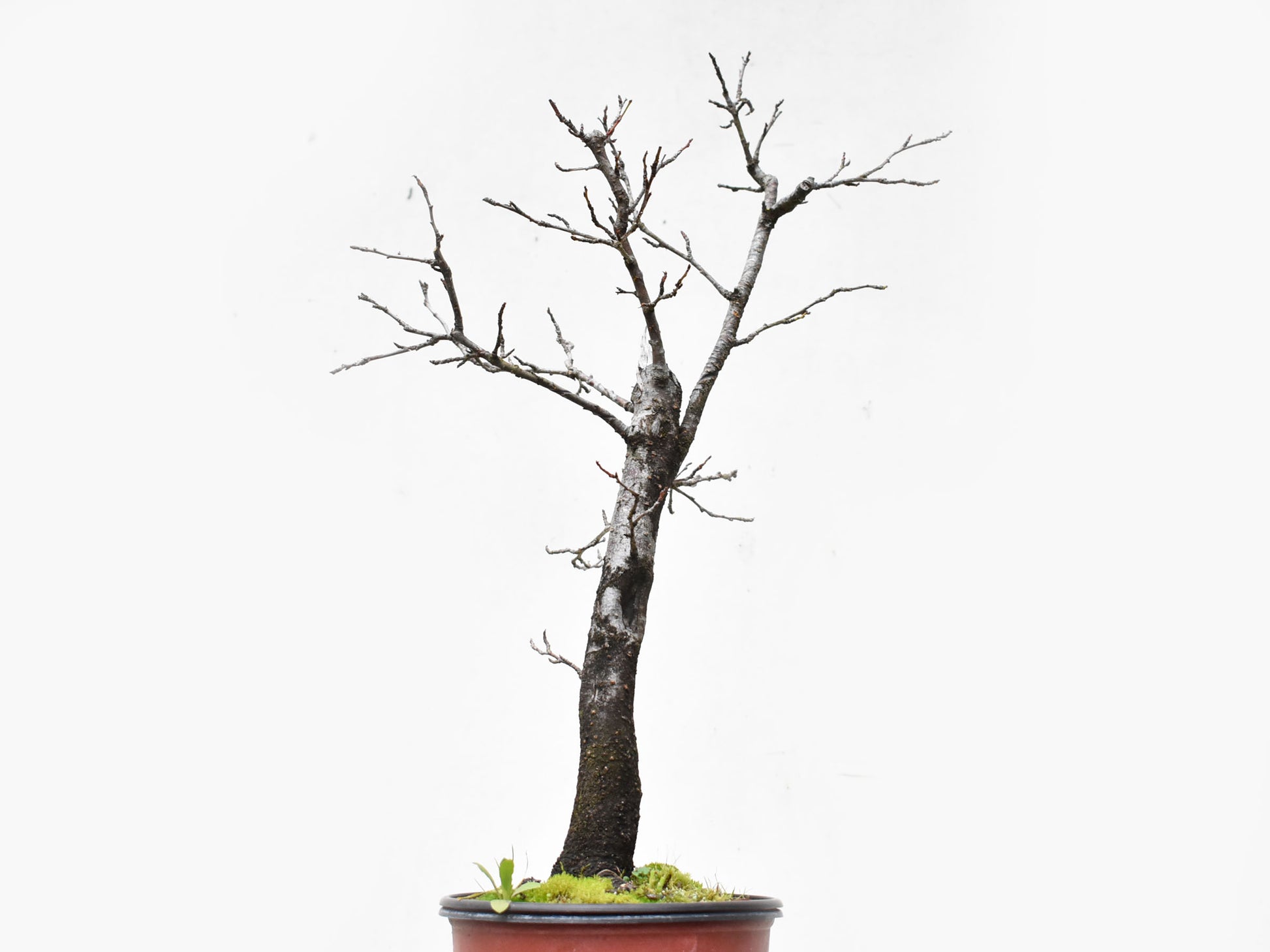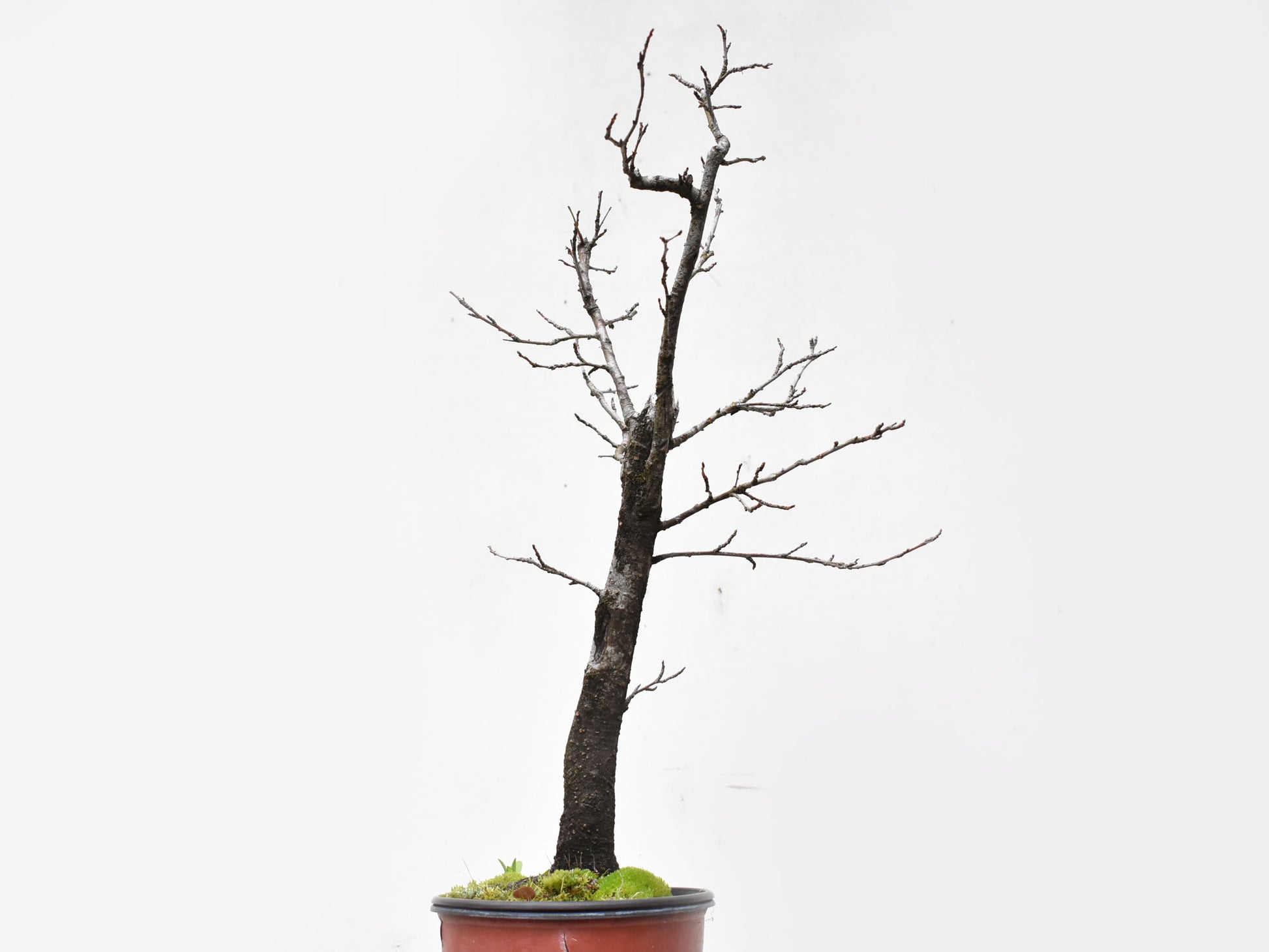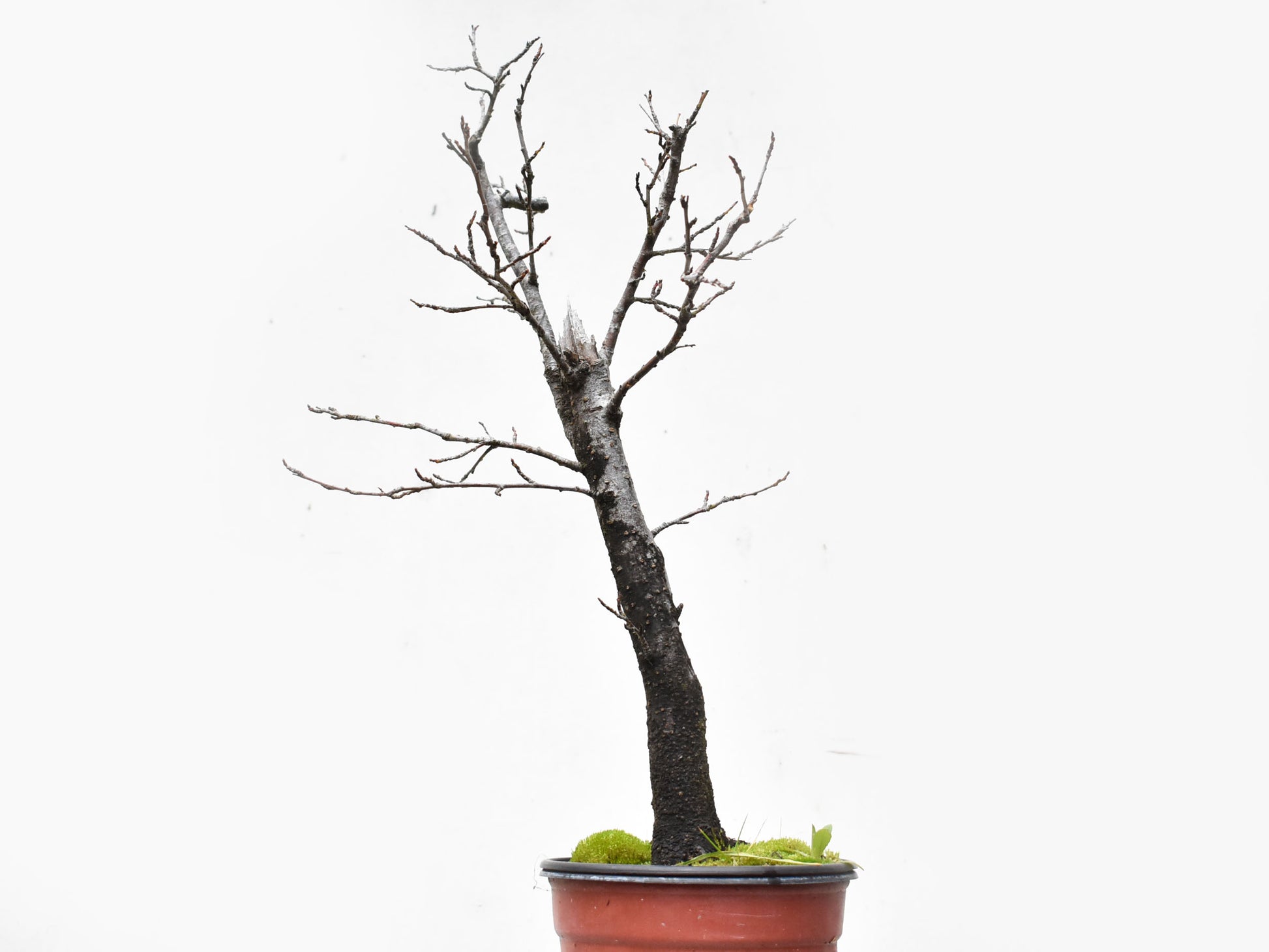 Se observa una vieja poda superior que ha dado lugar a un nuevo ápice. Esa cicatriz ya integra el diseño y puede desarrollarse como jin discreto o como parte de un futuro shari, en sintonía con el carácter silvestre del árbol.