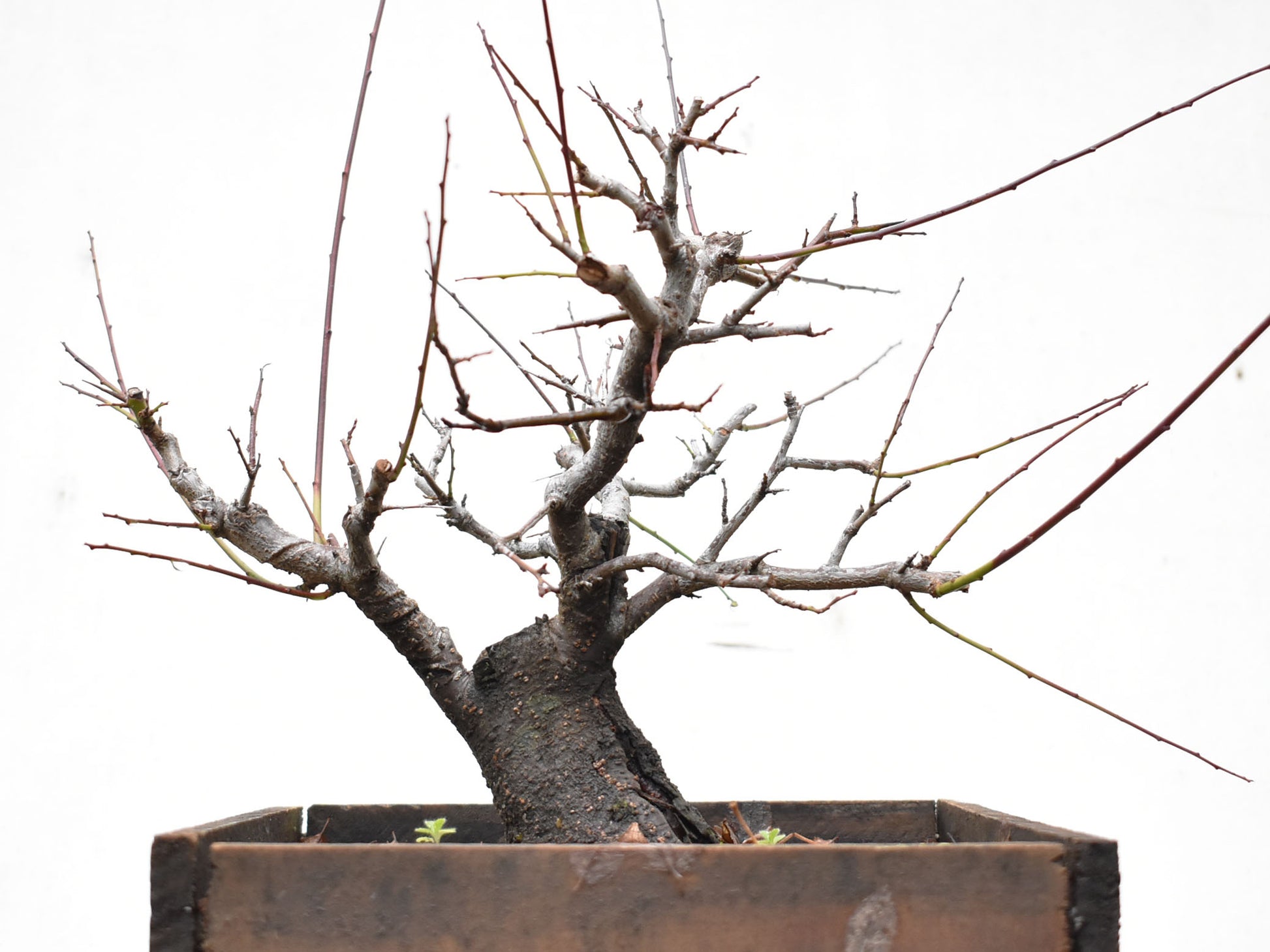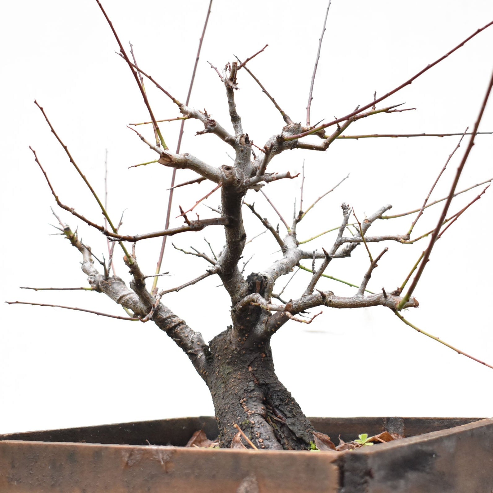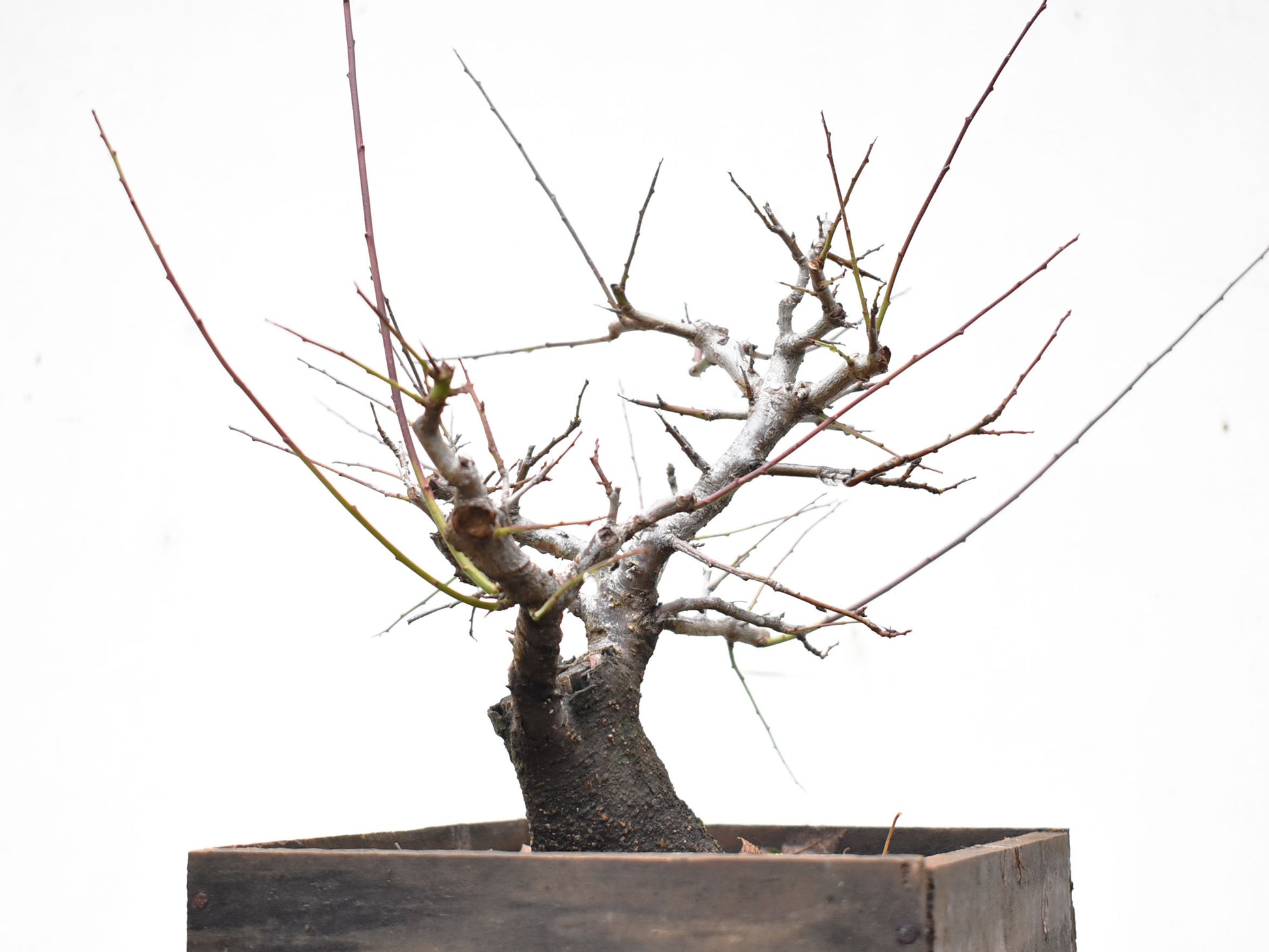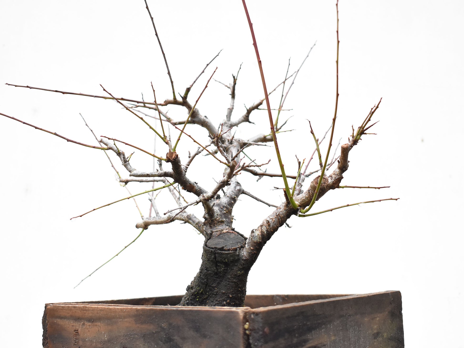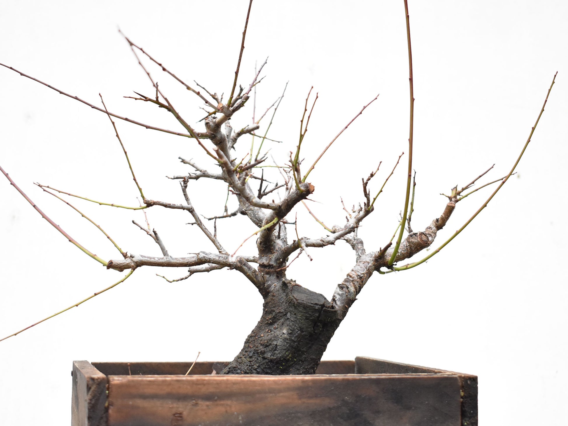 El árbol está lleno de brotes apicales vigorosos y ramas finas en formación, muchas de ellas ya alambradas o direccionadas para definir palcos. Esta etapa es clave para quienes deseen lograr un bonsái terminado en pocos años, sin sacrificar el carácter natural.