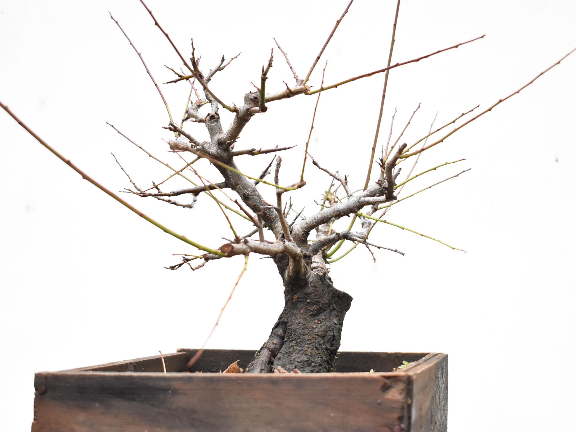 Actualmente en maceta de madera para favorecer el engrosamiento progresivo del nebari y el fortalecimiento general del árbol. Ideal para trasplante a colador o maceta de bonsái dentro de una o dos temporadas.