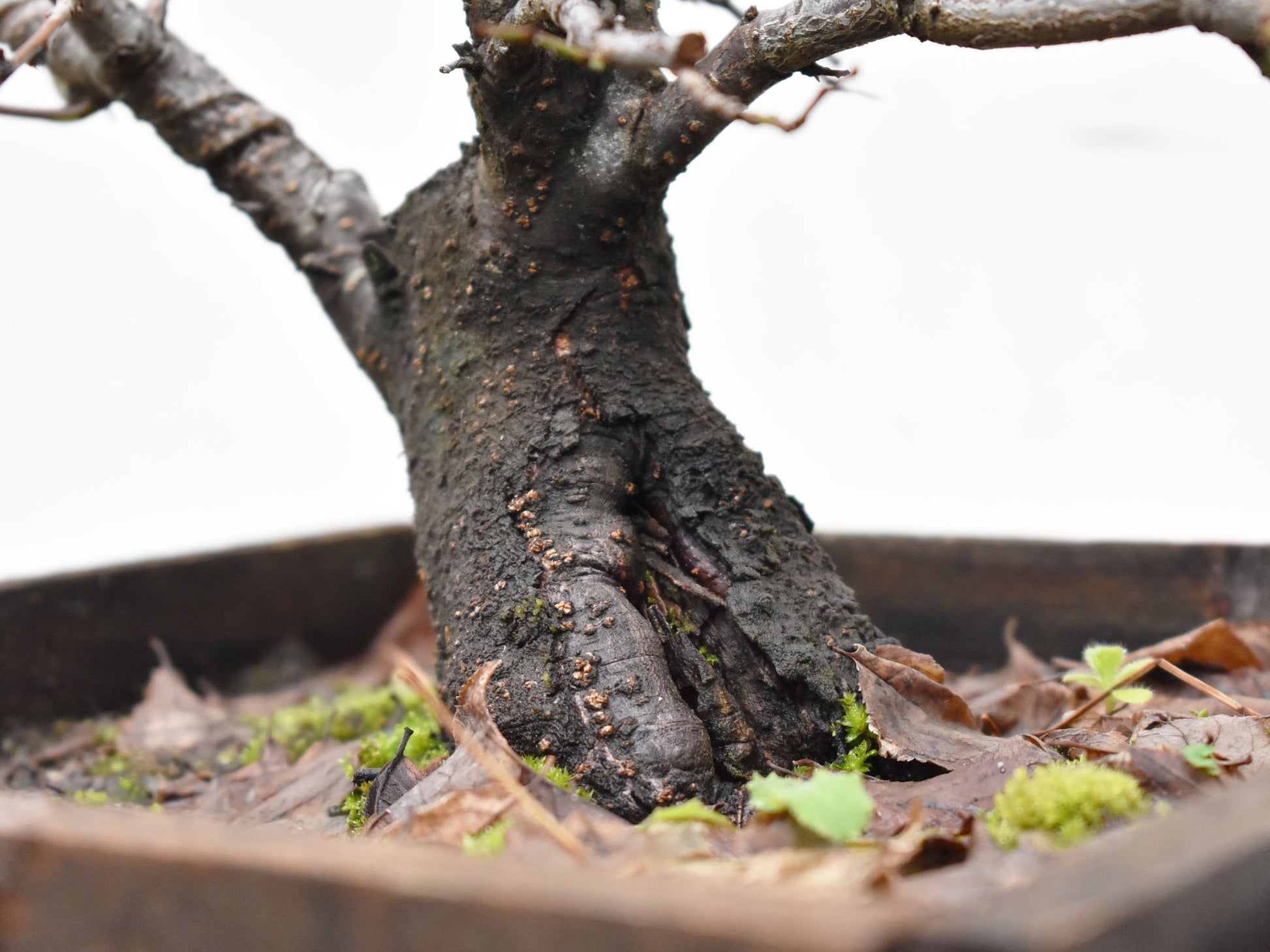 El nebari es ancho y afianzado, con raíces que emergen desde un tronco corto y robusto. La corteza tiene texturas diferenciadas entre zonas jóvenes y viejas, y se destaca una antigua cicatriz que ya comienza a integrarse al diseño como potencial elemento estético (shari o hueco viejo).
