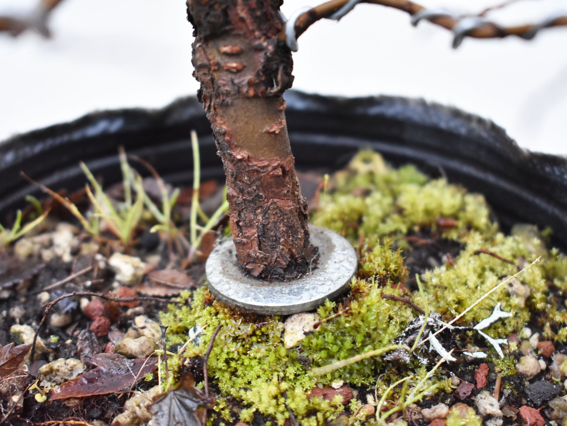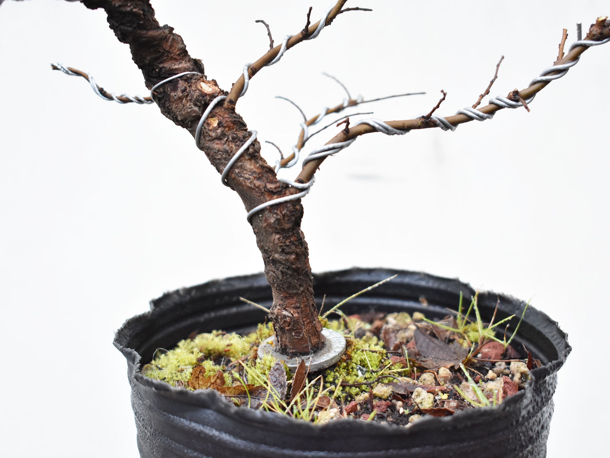 Plantin de Olmo Chino. Cultivado durante 4 años desde un pequeño esqueje, y con arandela para formar una buena base y luego acodar.