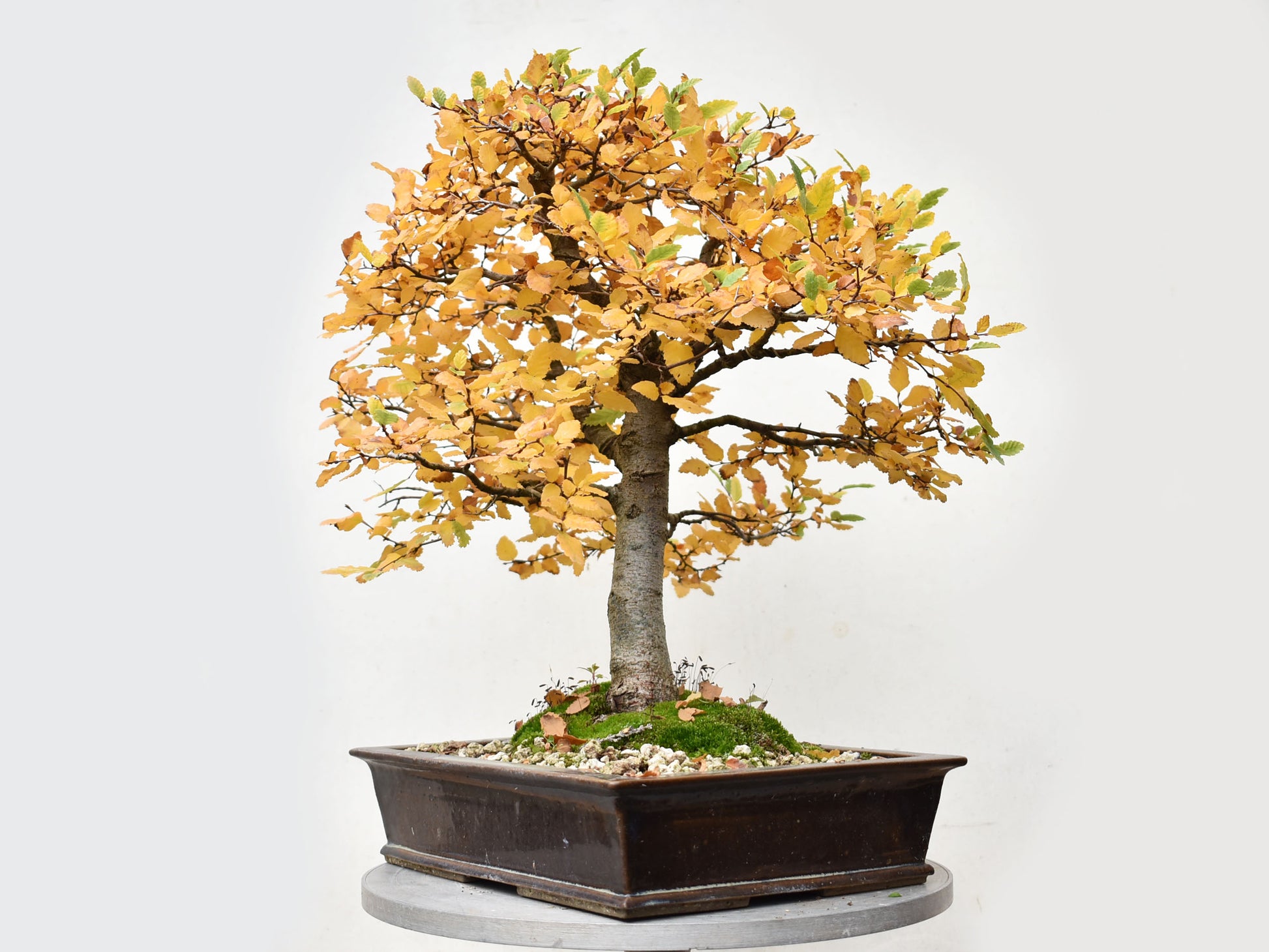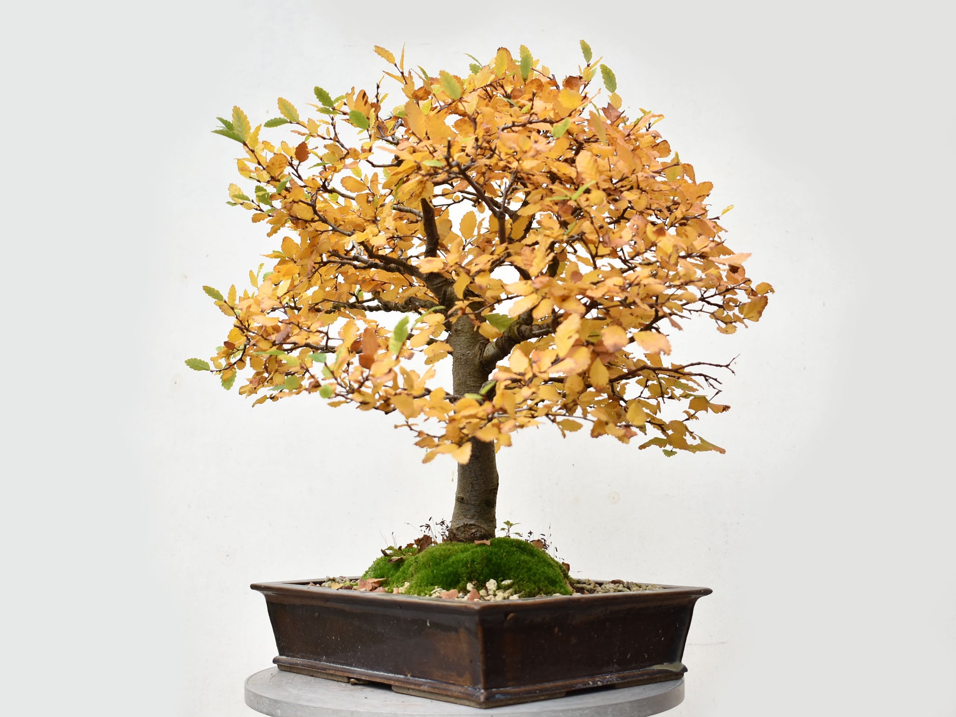 Bonsa de Roble Pellin (Nothofagus Obliqua), cultivado durante 10 años desde semilla. Sus ramas densas, hojas pequeñas y coloración otoñal, brindan una apariencia única